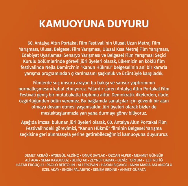 "60. Antalya Altın Portakal Film Festivali'nin Ulusal Uzun Metraj Film Yarışması, Ulusal Belgesel Film Yarışması, Ulusal Kısa Metraj Film Yarışması, Edebiyat Uyarlaması Senaryo Yarışması ve Belgesel Film Yarışması Seçici Kurulu bölümlerinde görevli jüri üyeleri olarak, ülkemizin en köklü film festivalinde Nejla Demirci'nin ‘Kanun Hükmü’ belgeselinin ani bir kararla yarışma programından çıkarılmasını şaşkınlık ve üzüntüyle karşıladık.