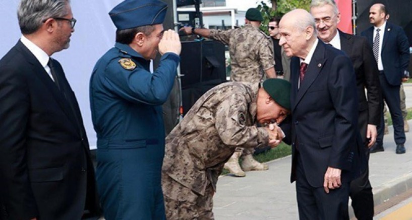 Bahçeli'yi Özel Harekat Başkanı Süleyman Karadeniz ve beraberindeki heyet karşılamış bu karşılama sırasında Karedeniz Devlet Bahçeli'nin elini öpmüştü.