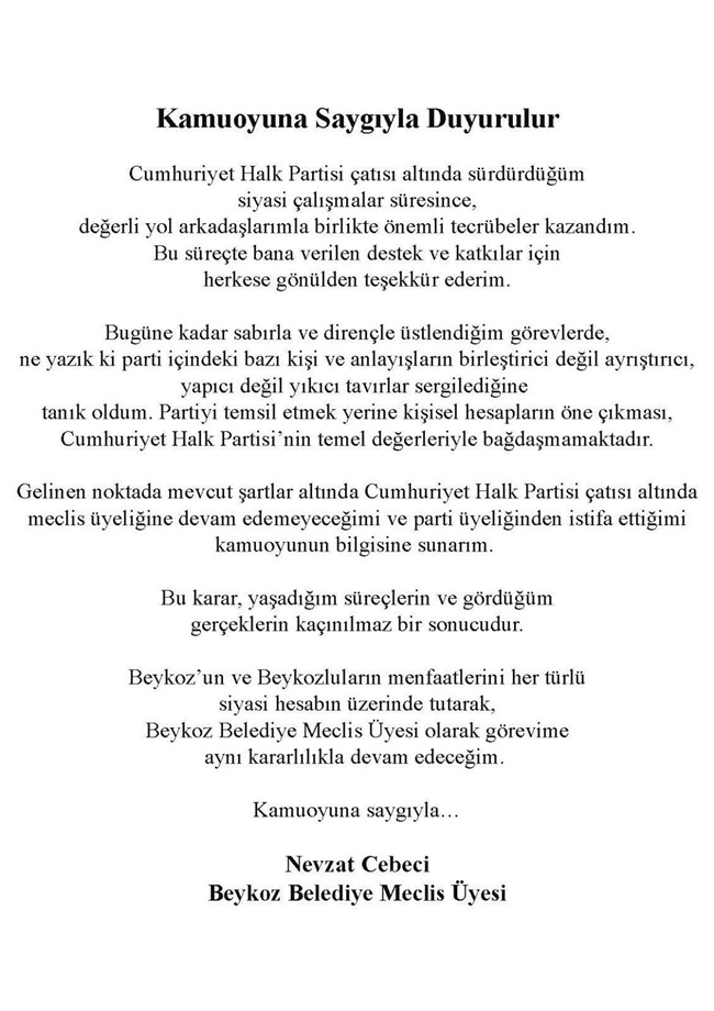 Gelinen noktada mevcut şartlar altında CHP çatısı altında meclis üyeliğine devam edemeyeceğimi ve parti üyeliğinden istifa ettiğimi kamuoyunun bilgisine sunarım.