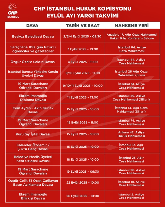 Çelik'in sosyal medya hesabından paylaştığı 14 davanın yeri ve zamanı şöyle: