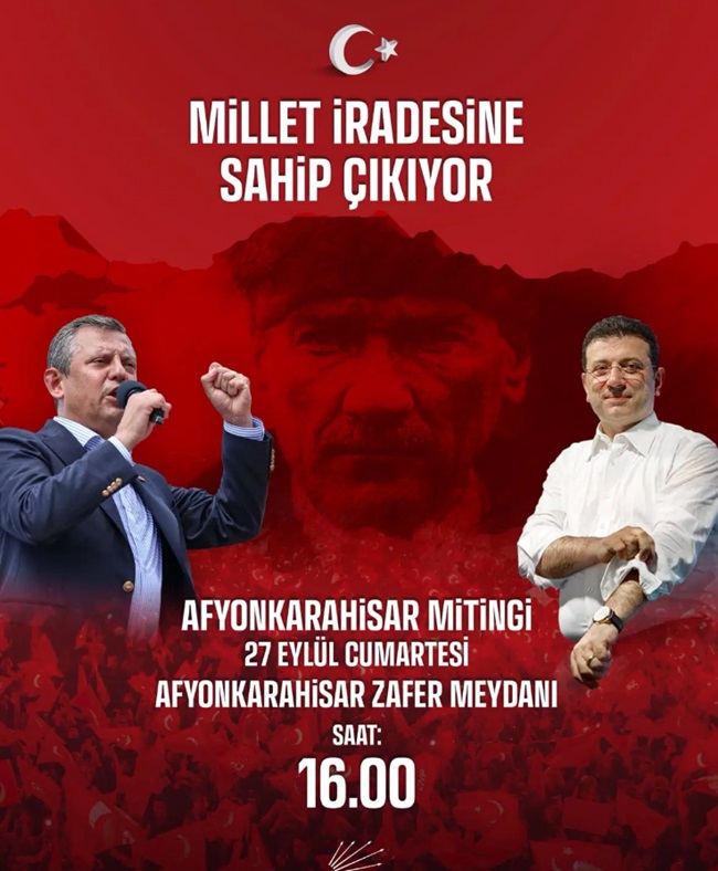 CHP'den paylaşılan afişe göre miting, 27 Eylül Cumartesi günü Afyonkarahisar'da gerçekleştirilecek.