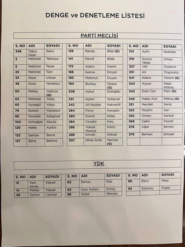 “Denge ve Denetleme Listesi” başlıklı listede Parti Meclisi adayları şöyle:
