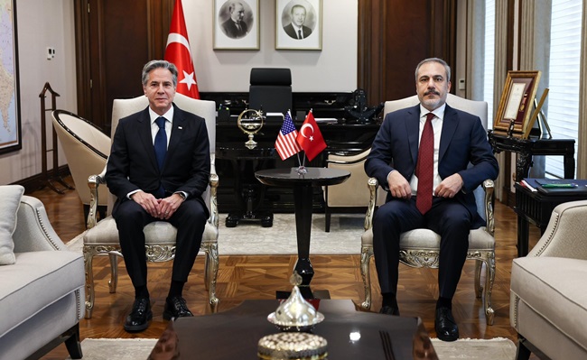 Dışişleri Bakanı Hakan Fidan, bugün Ankara'da ABD Dışişleri Bakanı Antony Blinken ile görüştü. Fidan, Blinken'ı Bakanlık'ta karşıladı. Saat 10:38'de başlayan baş başa ve heyetler arası görüşmeler yaklaşık 2,5 saat sürdü.