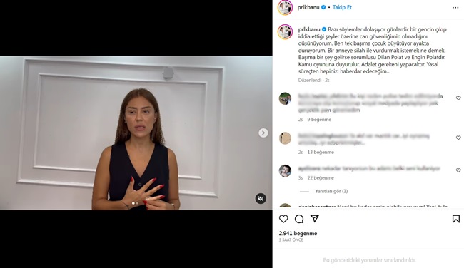 Sosyal medya hesabından açıklamalarda bulunan Sanatçı Banu Parlak, "Bazı söylemler dolaşıyor günlerdir bir gencin çıkıp iddia ettiği şeyler üzerine can güvenliğimin olmadığını düşünüyorum. Ben tek başıma çocuk büyütüyor ayakta duruyorum. Bir anneye silah ile vurdurmak istemek ne demek. Başıma bir şey gelirse sorumlusu Dilan Polat ve Engin Polat'tır. Kamu oyununa duyurulur. Adalet gerekeni yapacaktır. Yasal süreçten hepinizi haberdar edeceğim…" ifadelerinde bulundu.