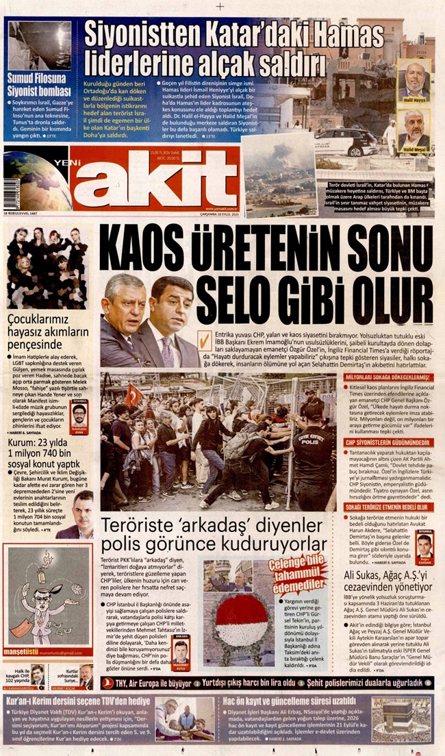 İktidara yakınlığıyla bilinen ve attığı başlıklar, kullandığı dil ile sürekli tepki çeken yandaş Yeni Akit, tutuklu eski HDP Eş Genel Başkanı Selahattin Demirtaş’ı ‘örnek göstererek’ Financial Times’a söyleşi veren CHP Genel Başkanı Özgür Özel’i hedef gösterdi.