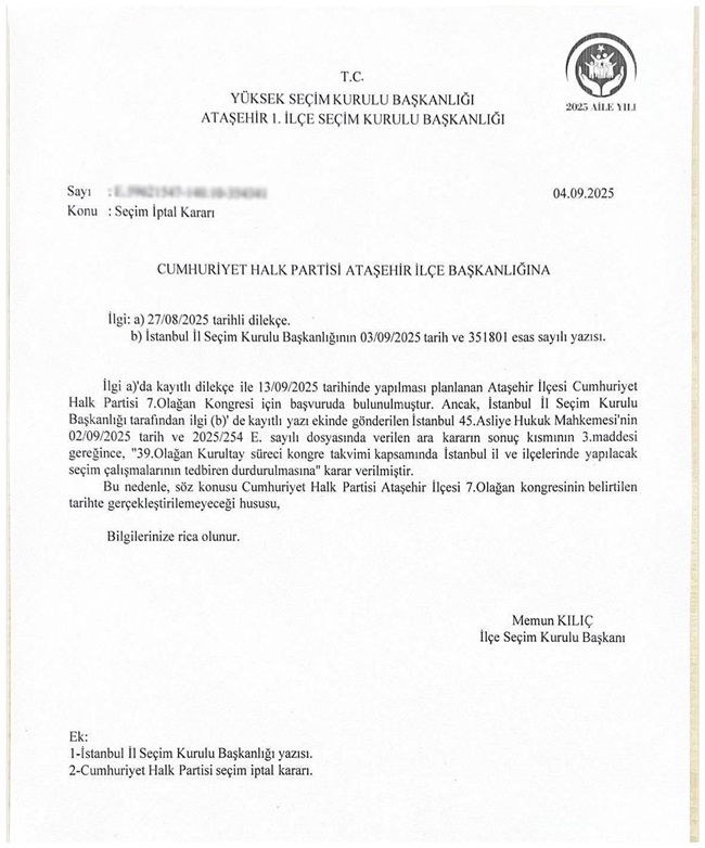 "13/09/2025 tarihinde yapılması planlanan Ataşehir İlçesi Cumhuriyet Halk Partisi 7. Olağan Kongresi için başvuruda bulunulmuştur. Ancak, İstanbul 45. Asliye Hukuk Mahkemesi’nin 02/09/2025 tarih ve 2025/254 E. sayılı dosyasında verilen ara kararın sonuç kısmının 3. maddesi gereğince, “39. Olağan Kurultay süreci kongre takvimi kapsamında İstanbul il ve ilçelerinde yapılacak seçim çalışmalarının tedbiren durdurulmasına” karar verilmiştir.