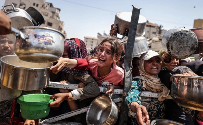 Birleşmiş Milletler'in kıtlık ilan ettiği Gazze'de, yerinden edilmiş Filistinliler yemek için uzun kuyruklar oluşturuyor.