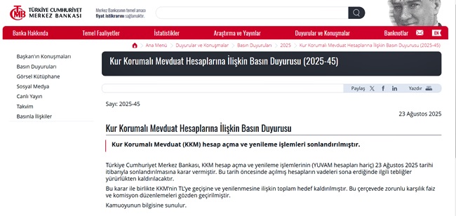 Türkiye Cumhuriyet Merkez Bankası (TCMB), Kur Korumalı Mevduat (KKM) hesaplarına ilişkin yeni kararını duyurdu. Bankadan yapılan açıklamada, KKM hesap açma ve yenileme işlemlerinin 23 Ağustos 2025 tarihi itibarıyla sona erdirileceği bildirildi. YUVAM hesapları ise kapsam dışında tutuldu.