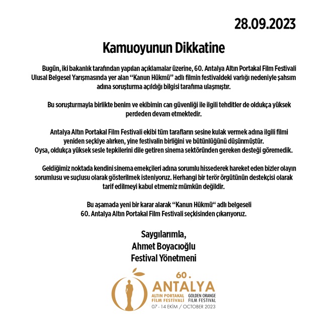 "Kanun Hükmü adlı filmin festivaldeki varlığı nedeniyle şahsım adına soruşturma açıldığı bilgisi tarafıma ulaşmıştır. Soruşturma ile birlikte benim ve ekibimin can güvenliği ile ilgili tehditler oldukça yüksek perdeden devam etmektedir. Oysa oldukça yüksek sesle tepkilerini dile getiren sinema sektöründen gereken desteği göremedik. Geldiğimiz noktada olayın sorumlusu ve suçlusu olarak gösterilmek isteniyoruz. Herhangi bir terör örgütünün destekçisi olarak tarif edilmeyi kabul etmemiz mümkün değildir. Kanun Hükmü adlı belgeseli, Festival seçkisinden çıkarıyoruz."
