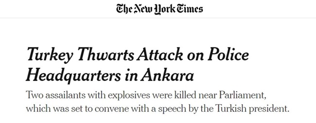 New York Times, "Ellerinde patlayıcı bulunan iki saldırgan, Türkiye Cumhurbaşkanı'nın konuşması için toplanacak olan Parlamento yakınlarında öldürüldü" dedi.
