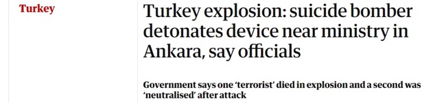 İngiltere'nin önde gelen gazetelerinden Guardian, Ankara'da yaşanan saldırıyı "Türkiye'de patlama: Yetkililer, intihar bombacısının Ankara'da bakanlık yakınlarında düzeneği patlattığını söyledi" başlığıyla servis etti.