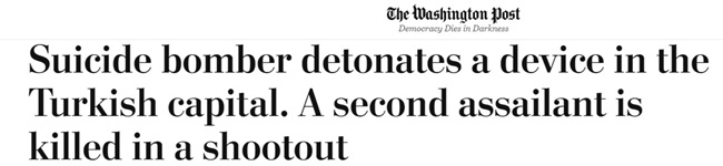 ABD'nin önde gelen gazetelerinden Washington Post, bakanlıklar bölgesindeki saldırıyı "İntihar bombacısı Türkiye'nin başkentinde, üzerindeki bombayı patlattı. İkinci bir saldırgan çatışmada öldürüldü" başlığıyla servis etti.