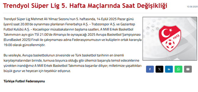 TFF, Fenerbahçe - Trabzonspor maçının A Milli Basketbol Takımı'nın EuroBasket finaliyle çakışmaması adına saat 19.00'a alındığını açıkladı.