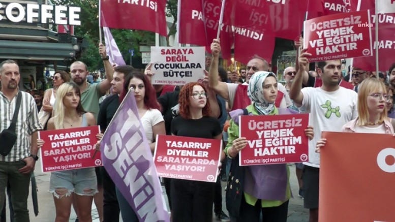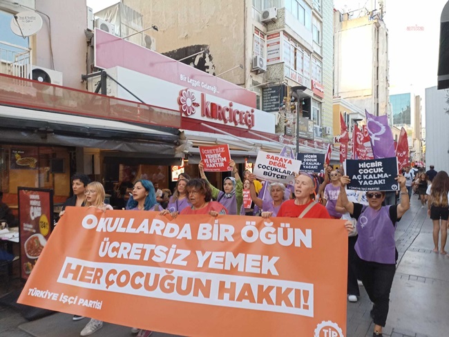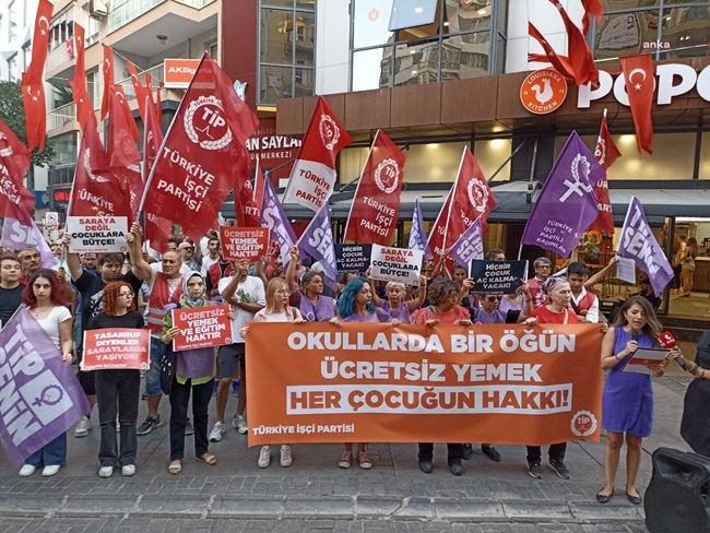 "Okullarda bir öğün ücretsiz yemek her çocuğun hakkı" yazılı pankart açan TİP İzmir üyeleri, ellerinde "Saraya değil çocuklara bütçe" , "Hiçbir çocuk aç kalmayacak" , "Ücretsiz yemek ve eğitim haktır" , "Tasarruf diyenler saraylarda yaşıyor" yazılı dövizler taşıdı. Partililer adına basın açıklamasını Avukat Sena Yazıbağlı Selanik okudu.