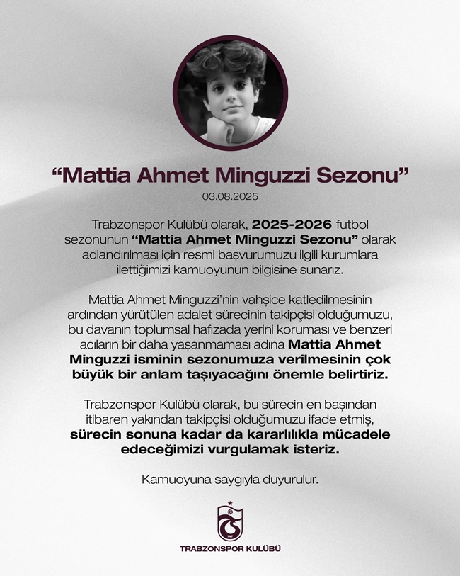 "2025-2026 futbol sezonunun Mattia Ahmet Minguzzi Sezonu olarak adlandırılması için resmi başvurumuzu ilgili kurumlara ilettiğimizi kamuoyunun bilgisine sunarız" açıklamsını yapan Trabzonspor şu değerlendirmeyi yaptı: