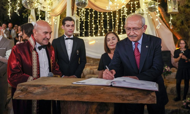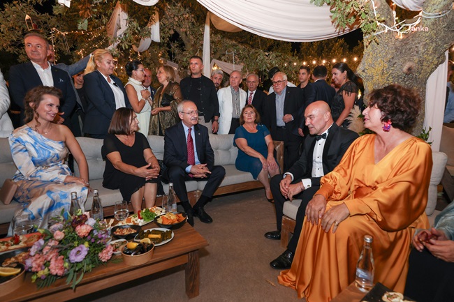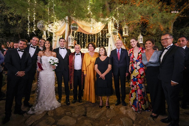 CHP Genel Başkanı Kemal Kılıçdaroğlu, eşi Selvi Kılıçdaroğlu ile birlikte İzmir Güzelbahçe’de İzmir Büyükşehir Belediye Başkanı Tunç Soyer ve Neptün Soyer’in kızları Duygu’nun düğün törenine katıldı.