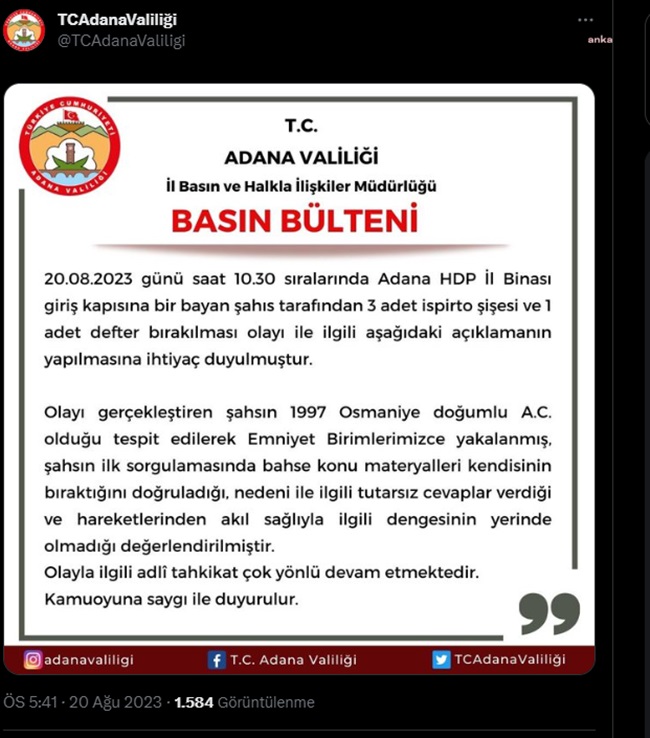 “20.08.2023 günü saat 10.30 sıralarında Adana HDP İl Binası giriş kapısına bir bayan şahıs tarafından 3 adet ispirto şişesi ve 1 adet defter bırakılması olayı ile ilgili aşağıdaki açıklamanın yapılmasına ihtiyaç duyulmuştur.