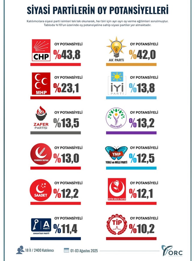 ORC Araştırma, 01-03 Ağustos 2025 tarihleri arasında 18 ilde 2400 katılımcıyla yaptığı seçim anketinde partilerin oy potansiyellerini ölçtü.